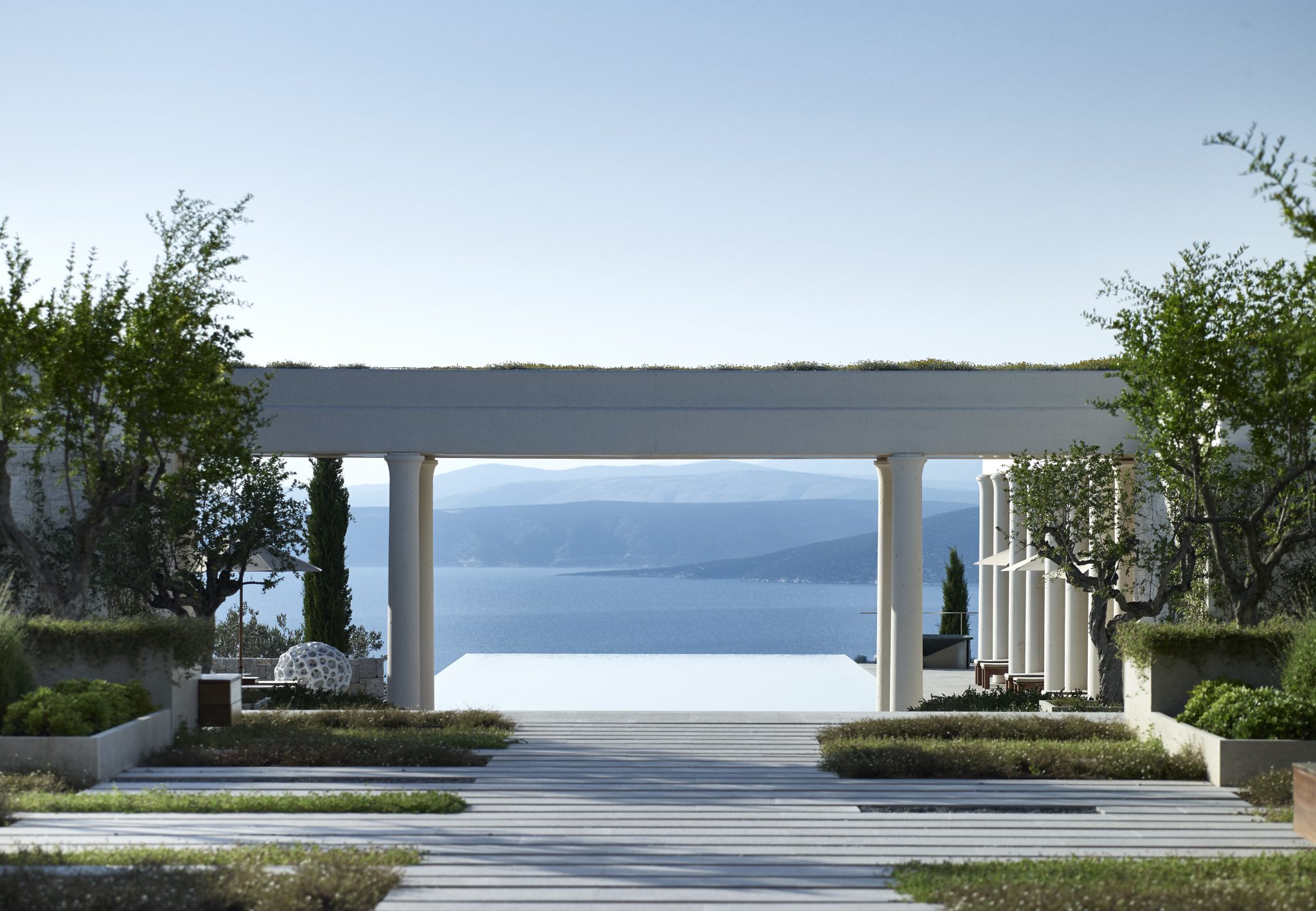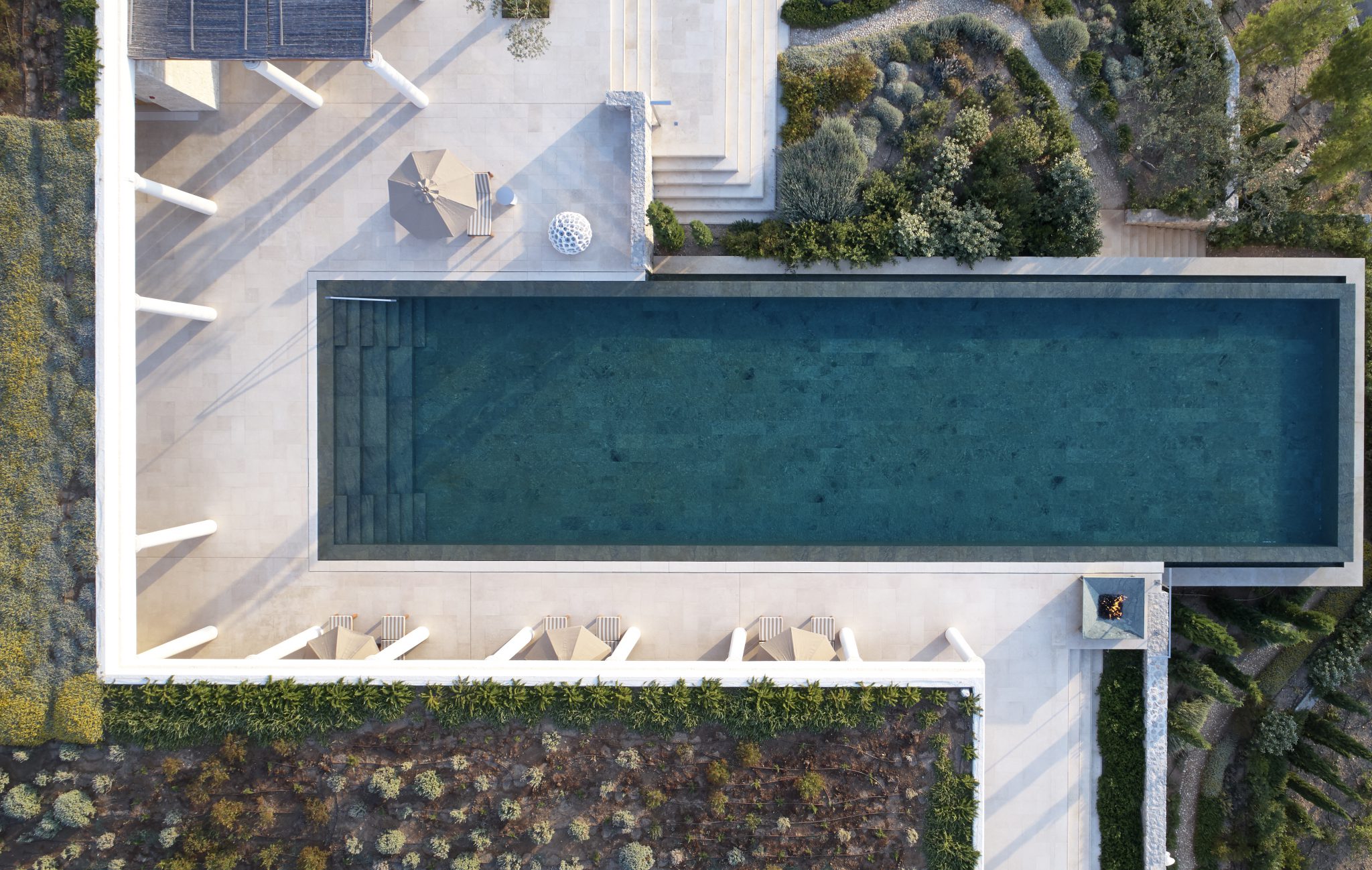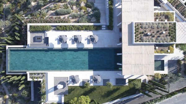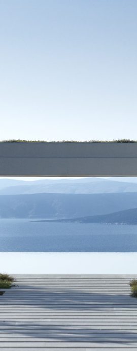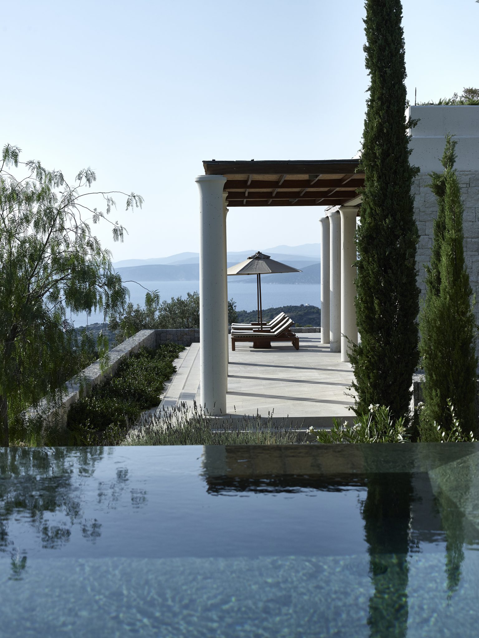 The “flagship” of Amanzoe branded Villas… “…Architectural Elements of the Classical Greek Golden Era, like “Post and Lintel”, have been very carefully used in a contemporary form. The White Formed Concrete Columns and Beams placed in a row to create a colonnade of columns (the Peristyle) and a rhythm which “aligns” the senses, as you move past it…”
