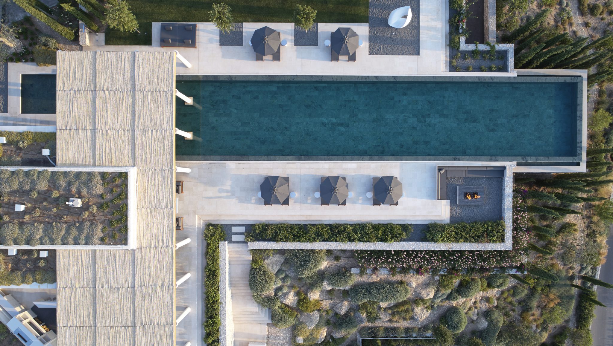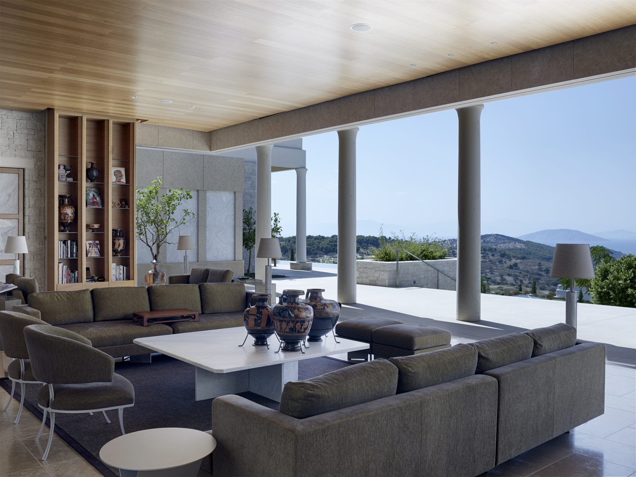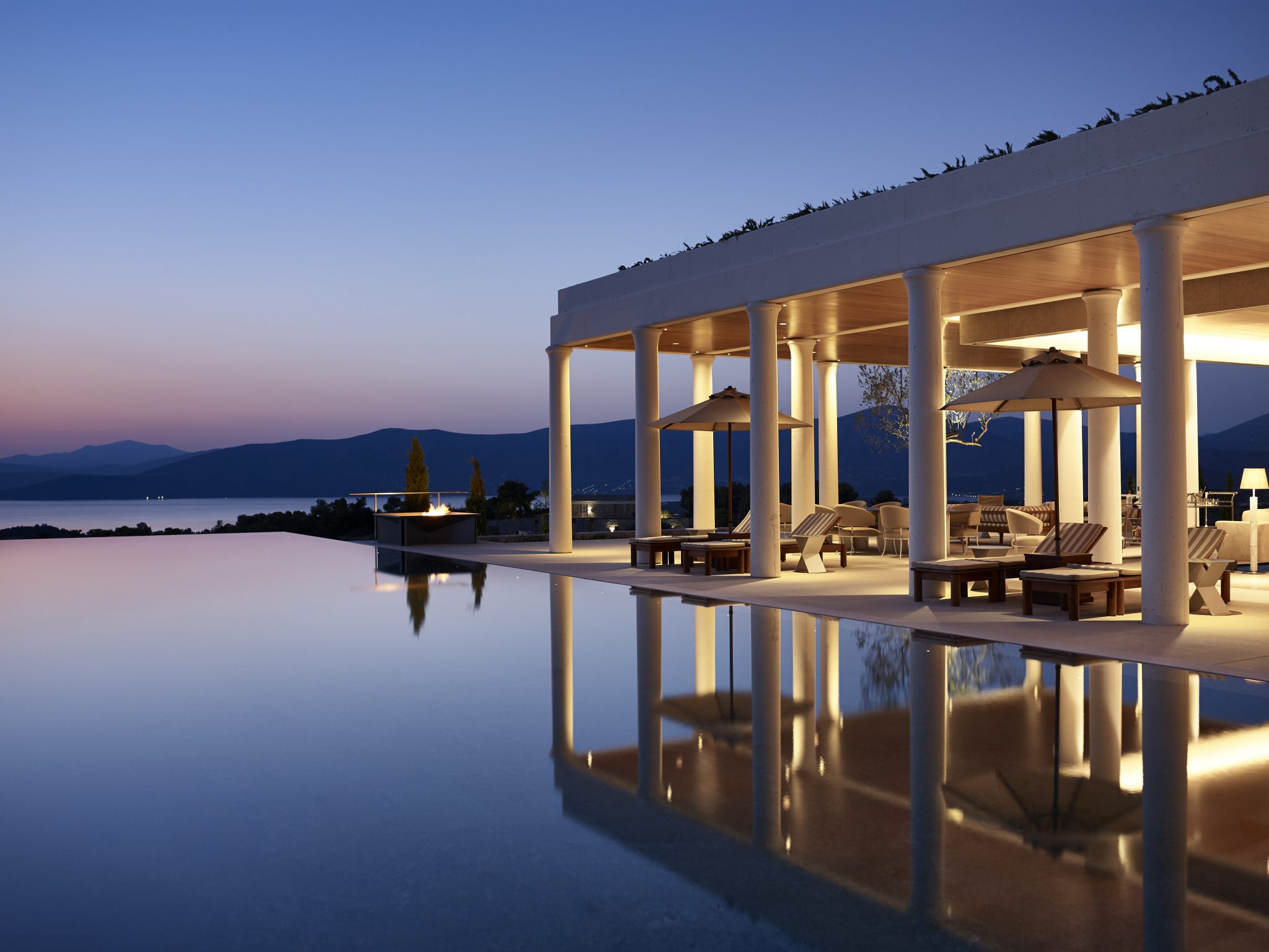 The “flagship” of Amanzoe branded Villas… “…Architectural Elements of the Classical Greek Golden Era, like “Post and Lintel”, have been very carefully used in a contemporary form. The White Formed Concrete Columns and Beams placed in a row to create a colonnade of columns (the Peristyle) and a rhythm which “aligns” the senses, as you move past it…”